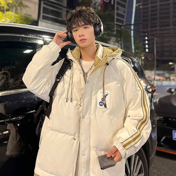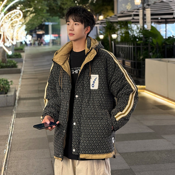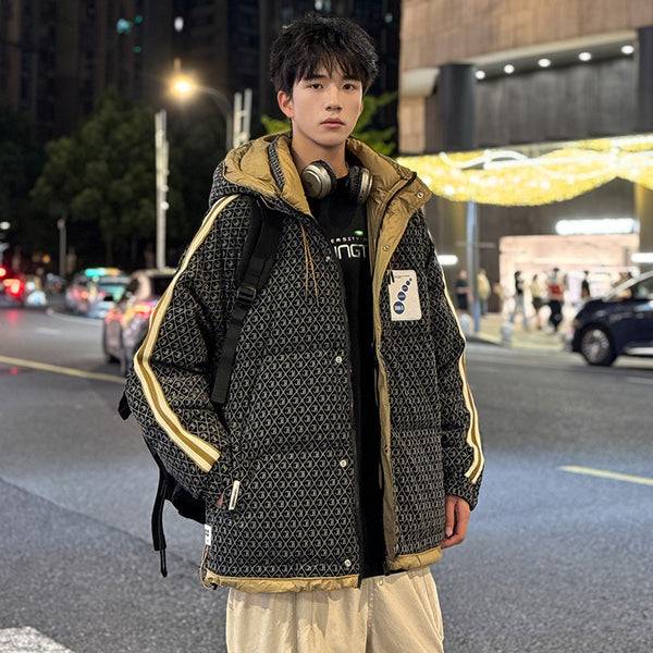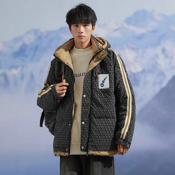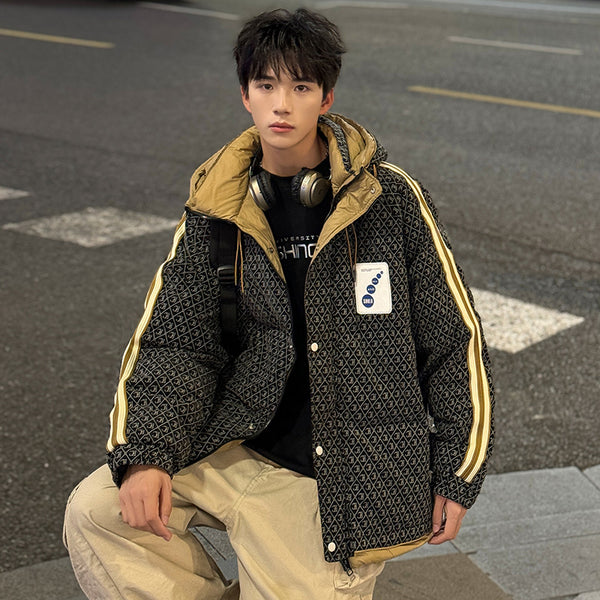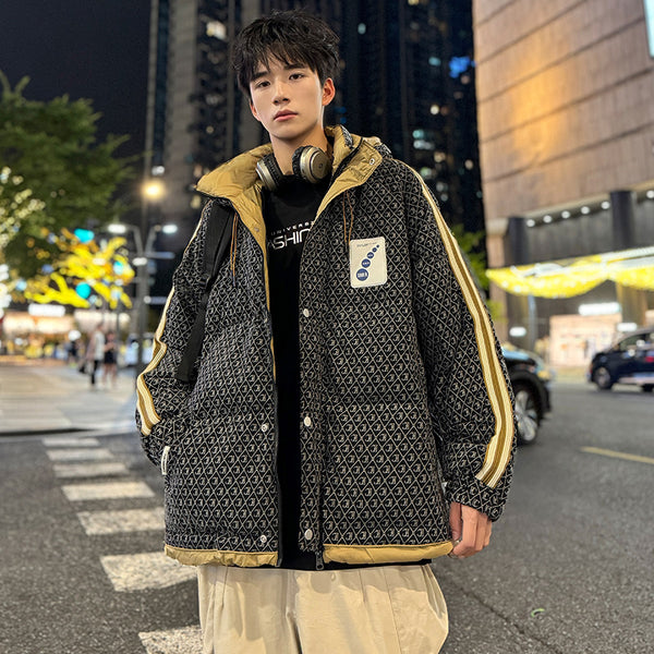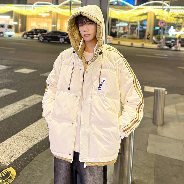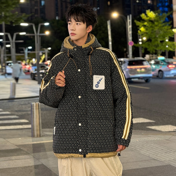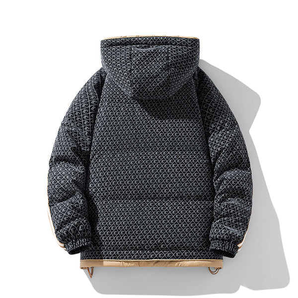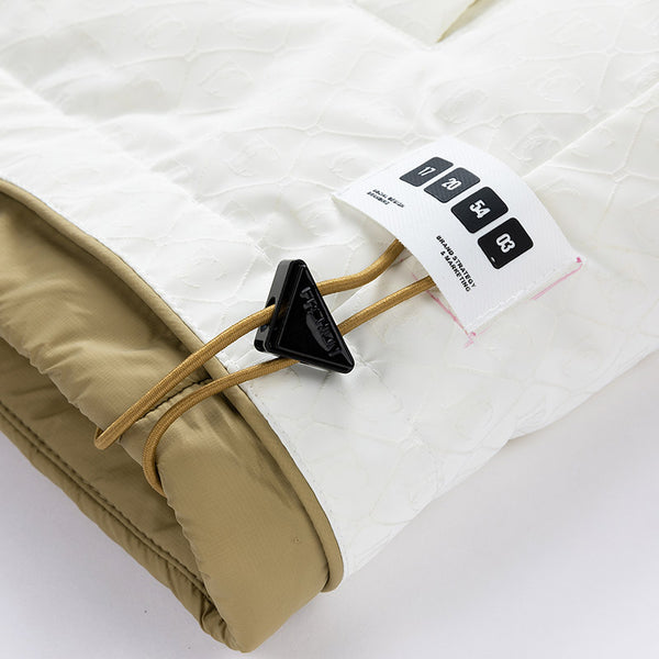 Fashion-forward winter puffer. Embossed IC monogram provides tactile luxury. Lightweight thermal cloud-fill keeps warmth. Double-stripe sleeves enhance streetwear aesthetic. Oversized fit allows layered outfits. Storm flap and zipper lock in heat. Interior contrast palette provides premium look. Ideal for urban streets, casual winter wear, and city fashion.