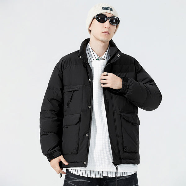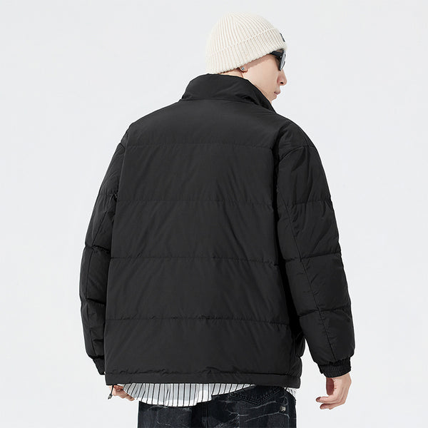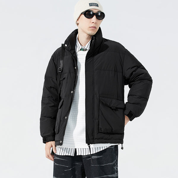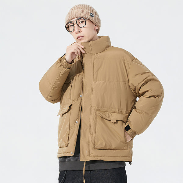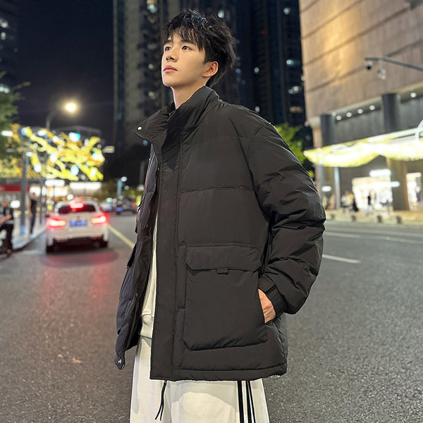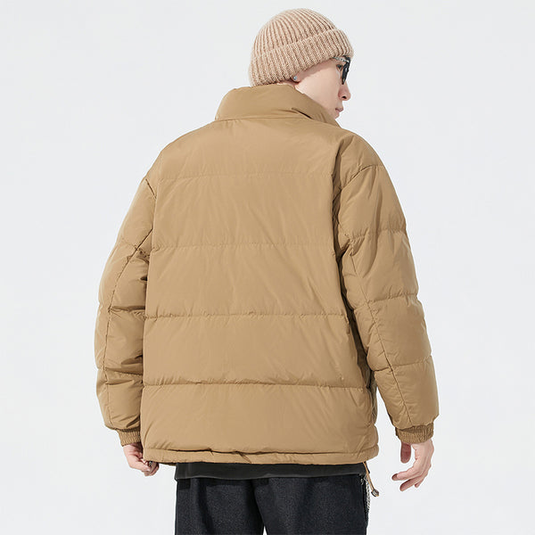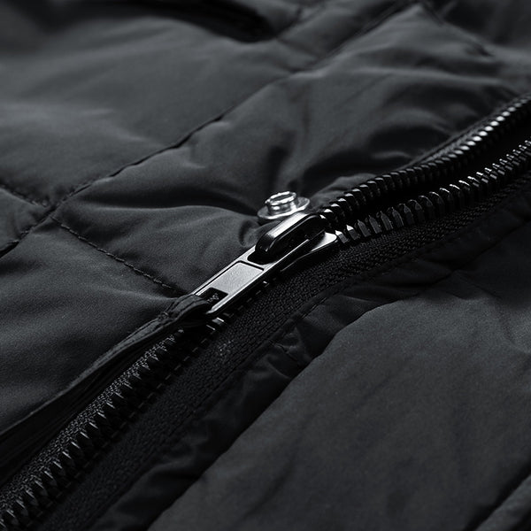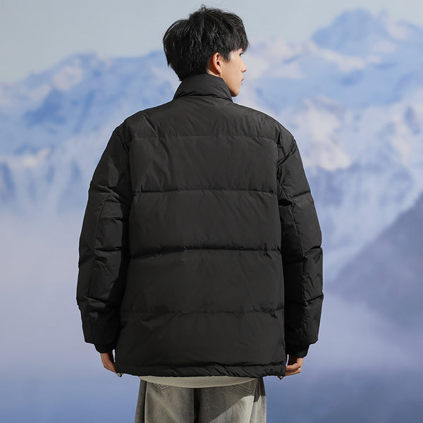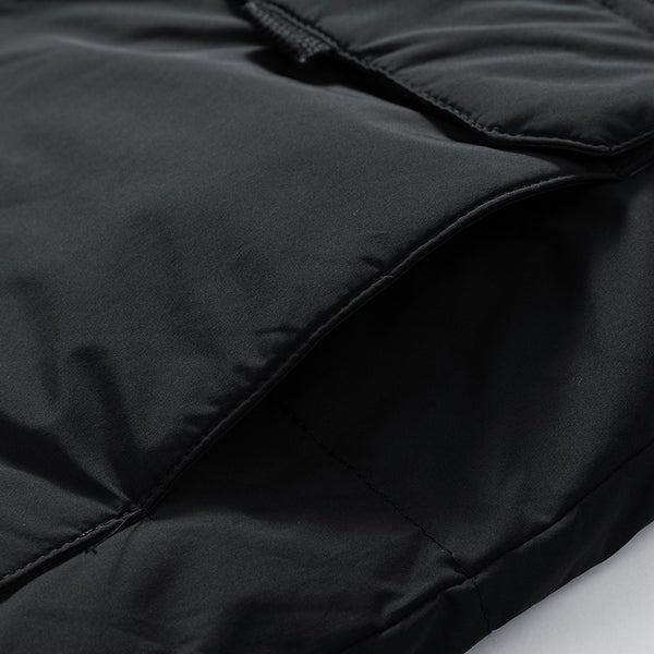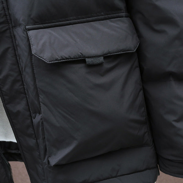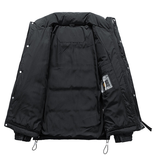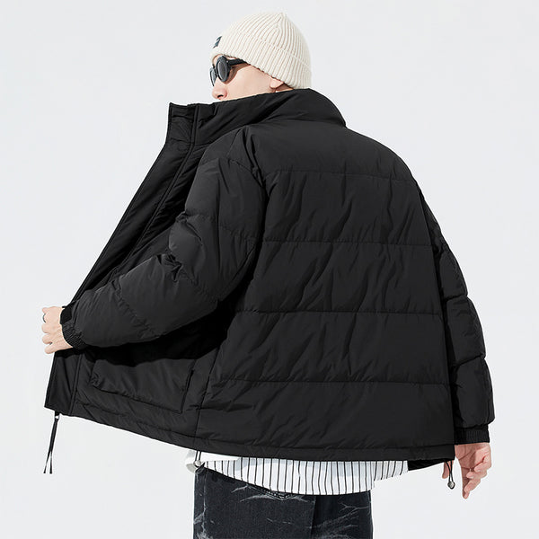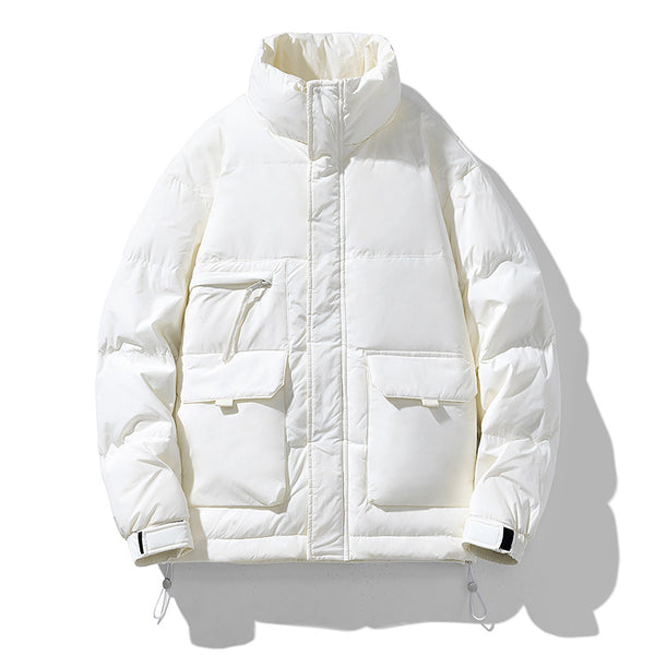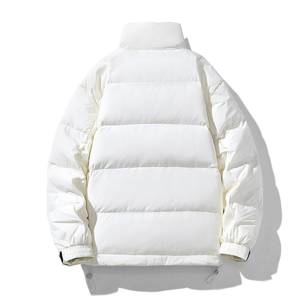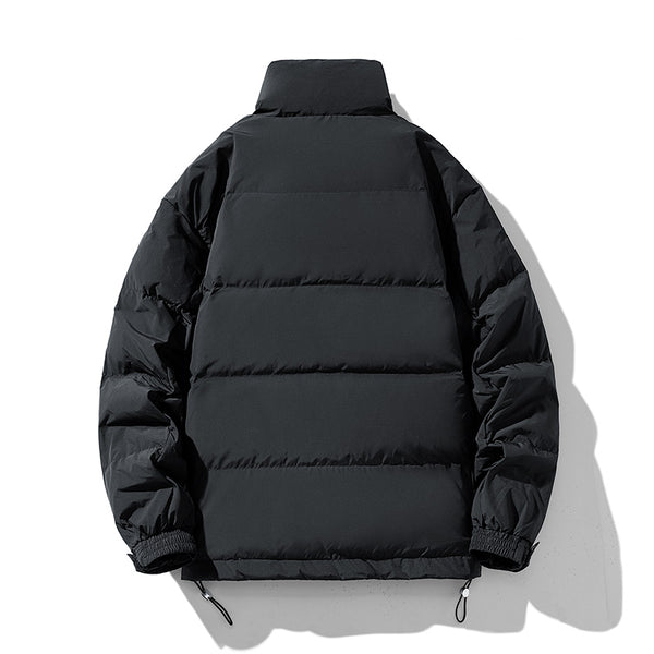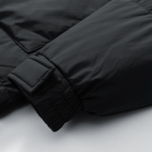 Urban winter jacket with a sleek minimalist design. High-neck collar provides protection from wind. Thick insulation ensures consistent warmth. Structured panels offer a clean, polished look. Dual front utility pockets add functionality. Adjustable hem drawcord locks in heat and allows a tailored fit. Works well with hoodies, denim, or joggers. Perfect for city streets, travel, or daily winter wear.