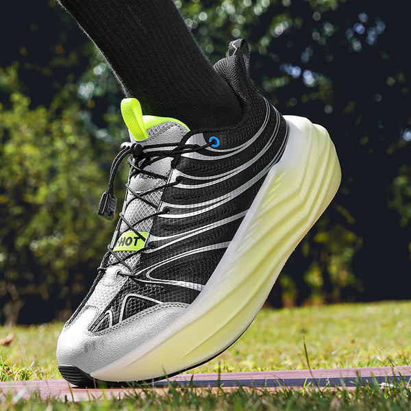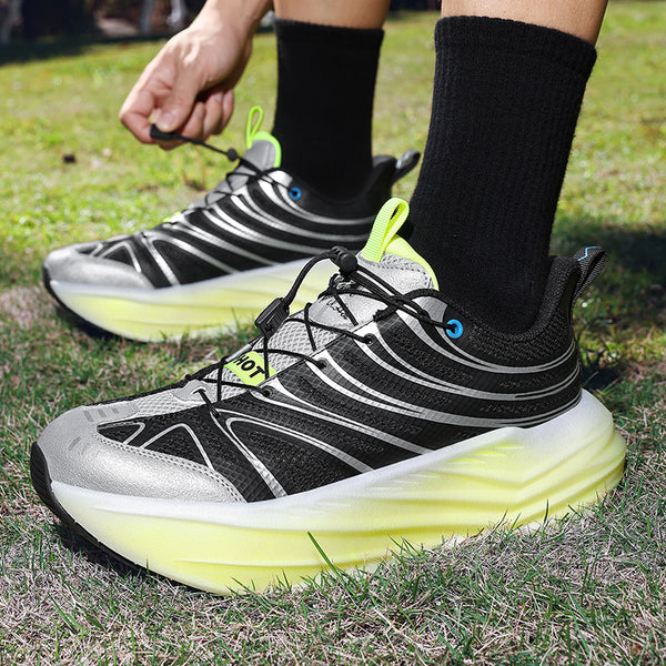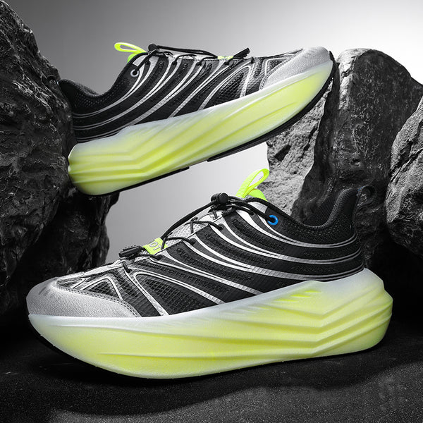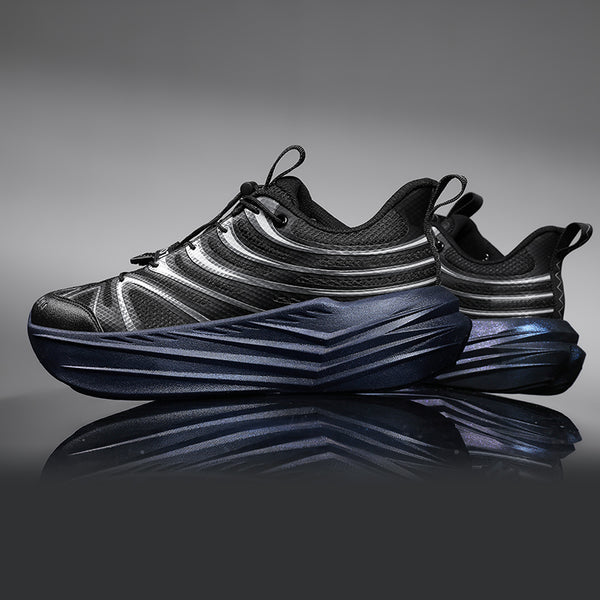 Fluid-Line Overlay Design: Metallic and high-contrast TPU waves wrap the upper, providing structural support while mimicking the look of speed in a vacuum.