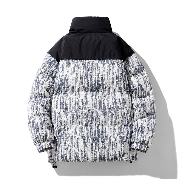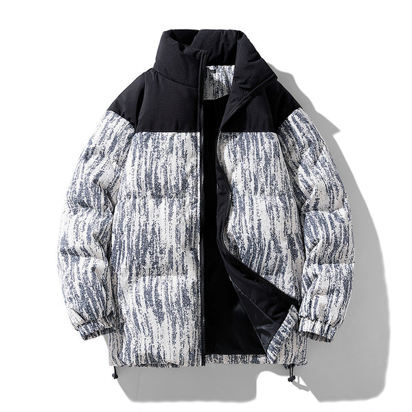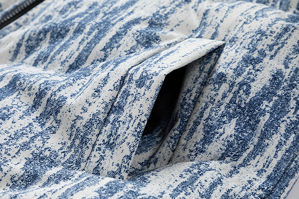 The Z705 features a striking vertical "Static Blur" print that creates a sense of motion and texture. Topped with a solid matte-black yoke and high-stand collar, the jacket offers a sharp, geometric contrast that frames the face and shoulders for a powerful silhouette.