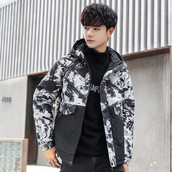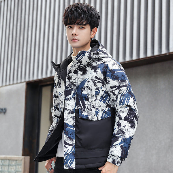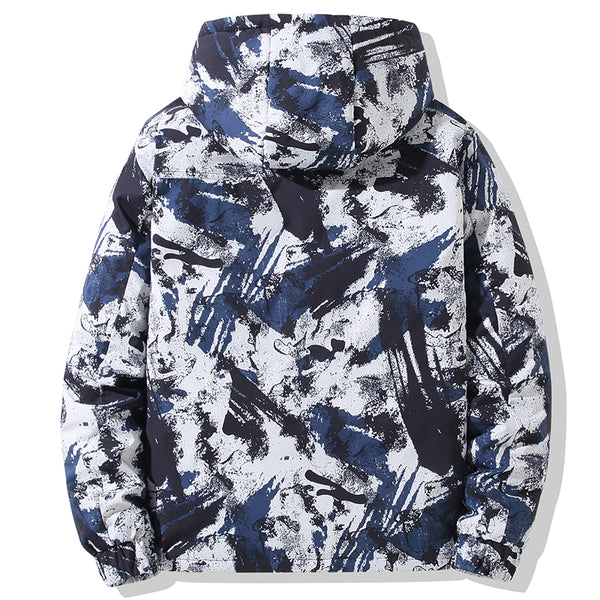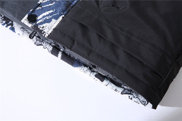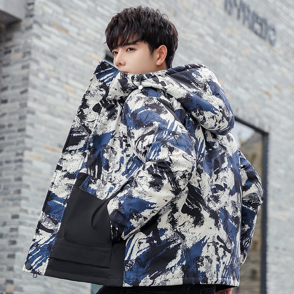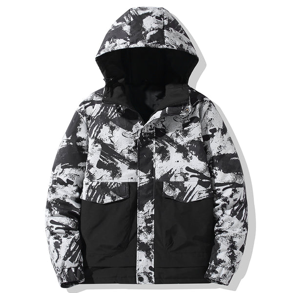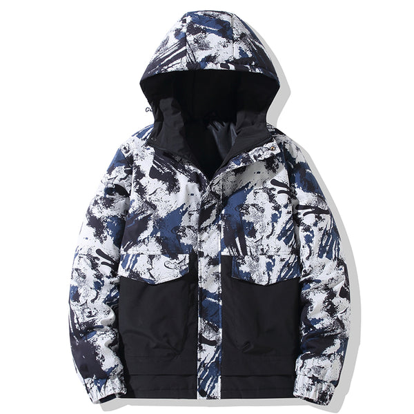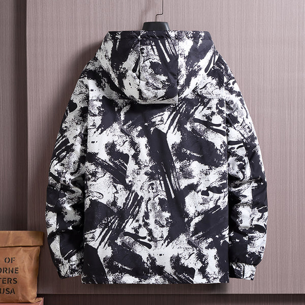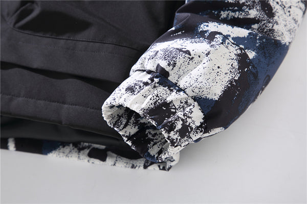 • Abstract "Ink Splash" Graphic: A bold, multi-tonal brushstroke pattern covers the upper body and hood, creating a unique visual texture that stands out in a sea of plain winter coats.