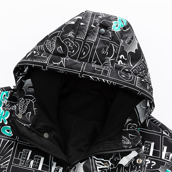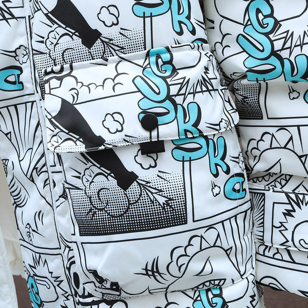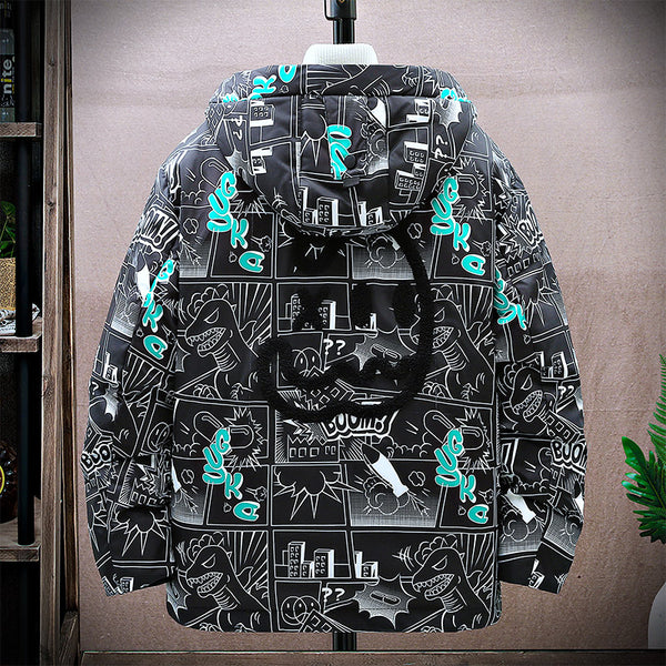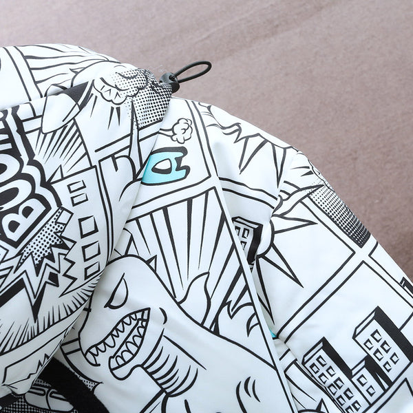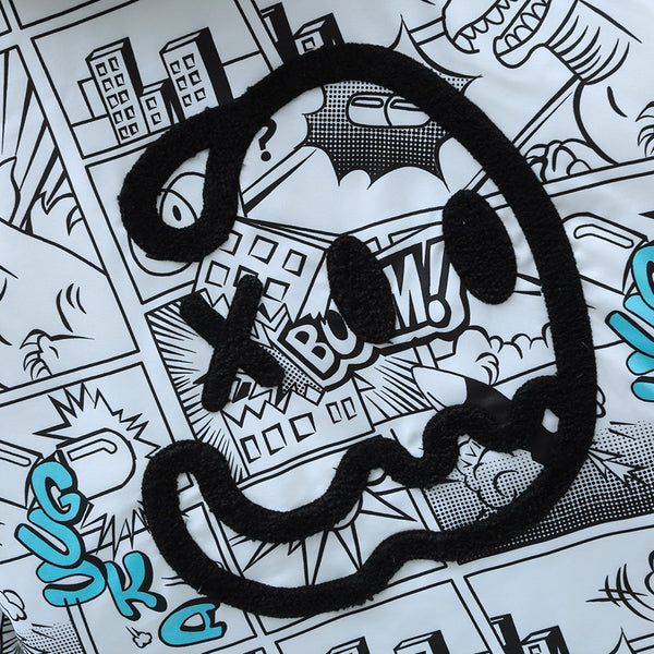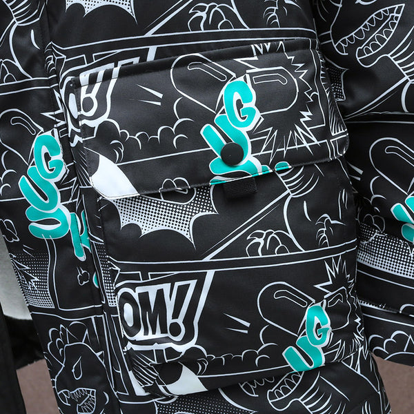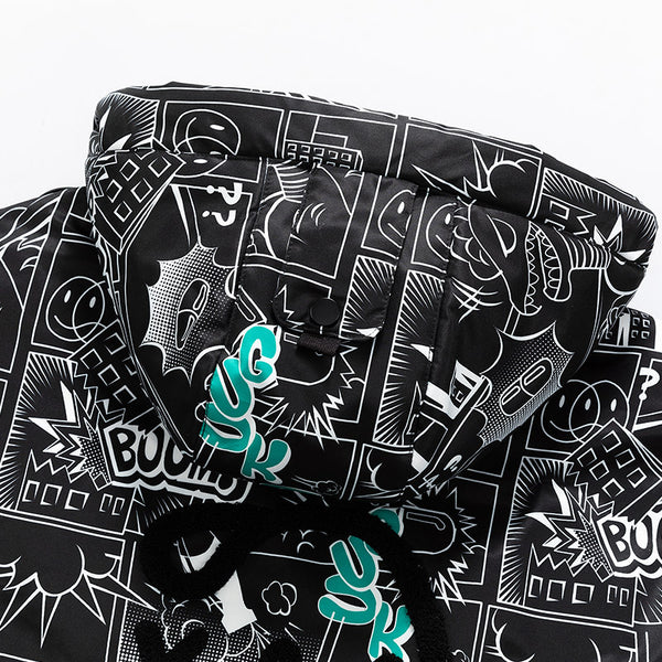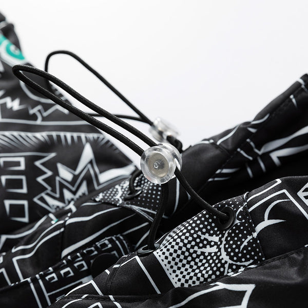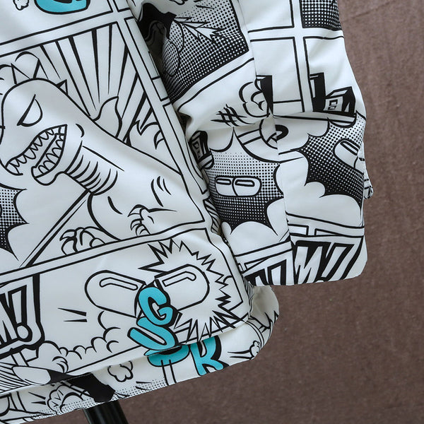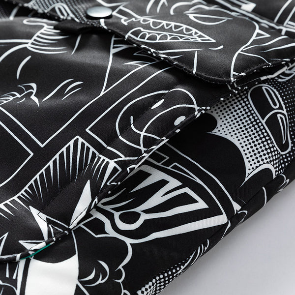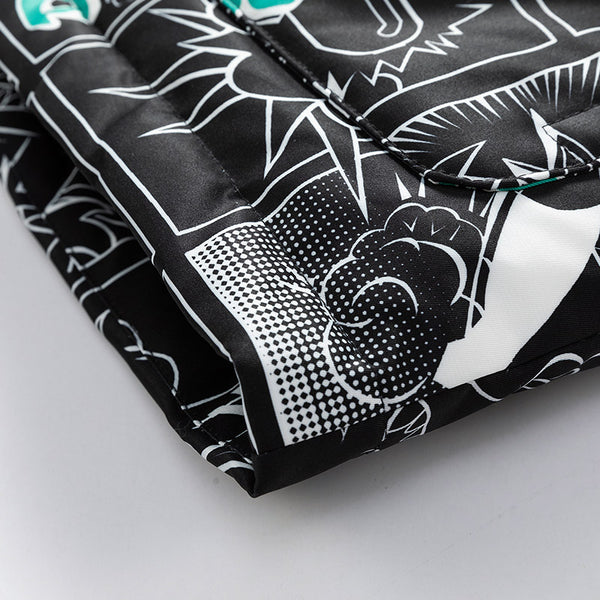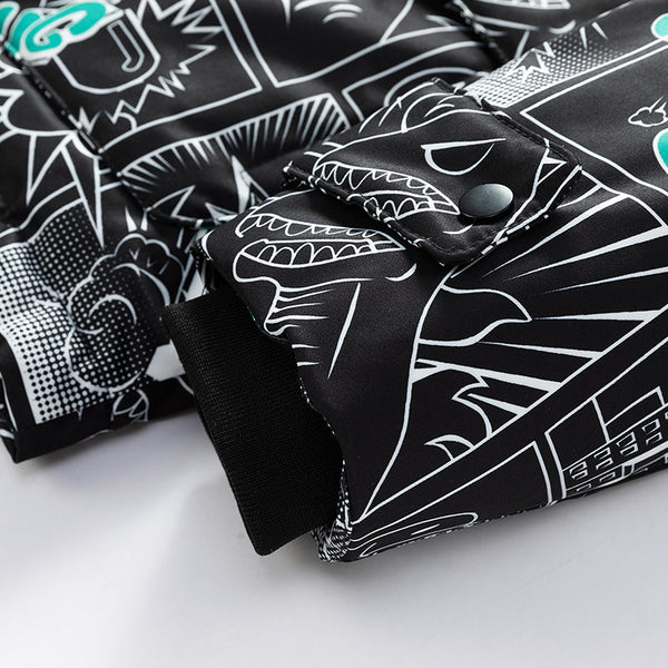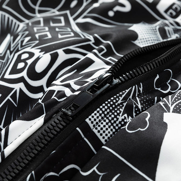 The MLB Z720 features an all-over illustrated panel print that feels dynamic, playful, and edgy at the same time. Comic-style graphics, abstract characters, and sharp line art create a layered visual story across the jacket. Subtle aqua accents cut through the monochrome base, adding depth and energy without overpowering the design.