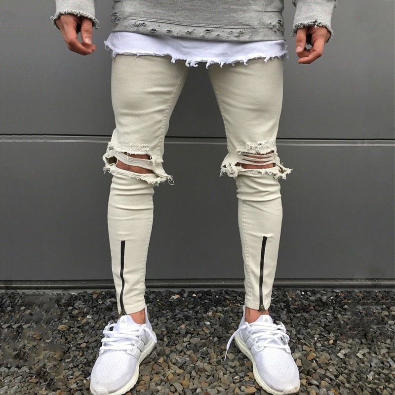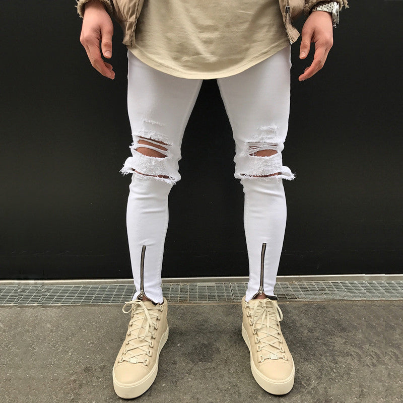 White Skinny Knee Ripped Ankle Zipper Jeans
