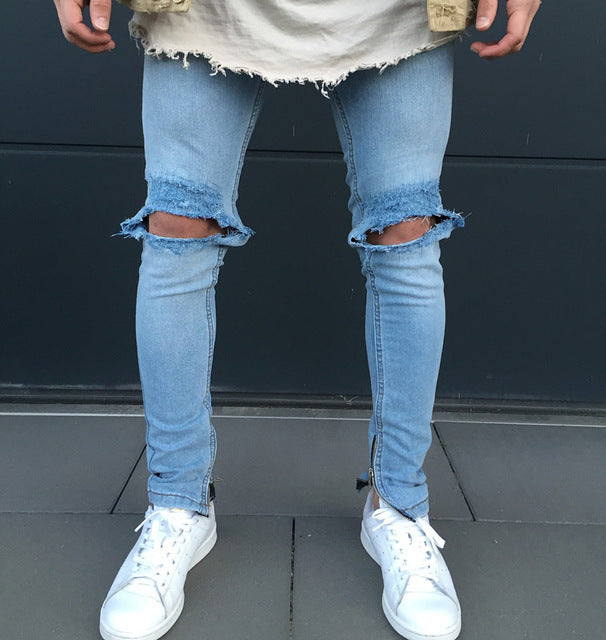 Light Blue Skinny Knee Ripped Ankle Zipper Jeans