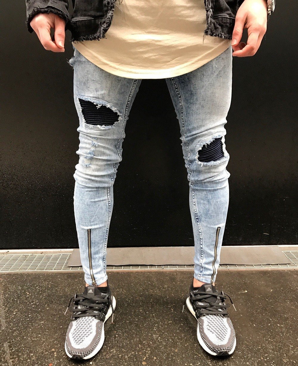 Light Blue Ripped Skinny Side Stripe & Ankle Zipper Jeans