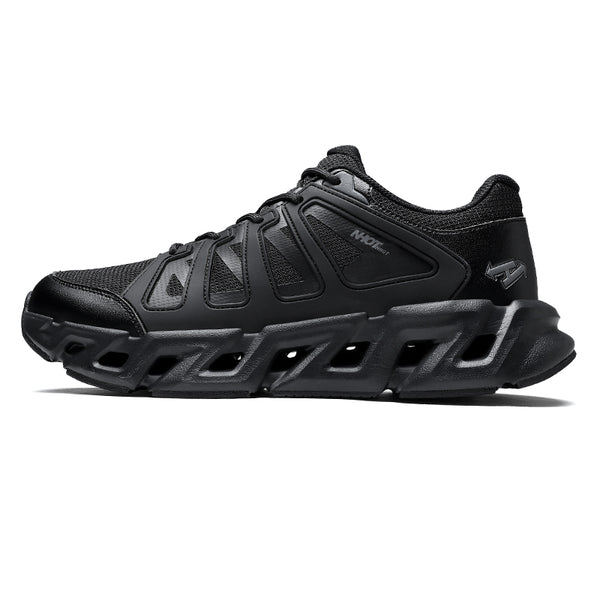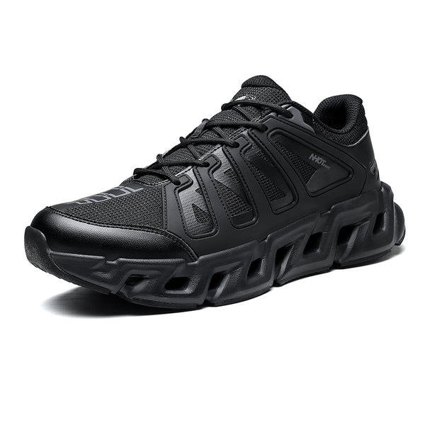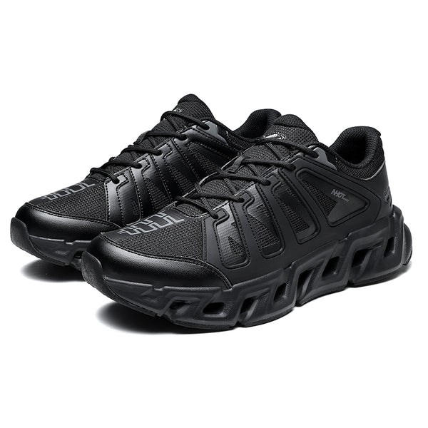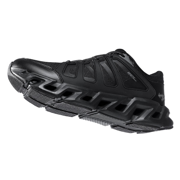 The upper blends armored paneling with breathable technical mesh, creating a controlled balance between airflow and protection. Reinforced side frames carve a dynamic profile, enhancing lateral stability while adding a bold, mechanical aesthetic. The toe structure is subtly shielded, built to withstand daily impact without sacrificing sleekness.