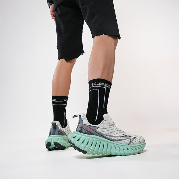 The sneakers in the images belong to the futuristic running and lifestyle sneaker category with a bold, sculpted sole design for maximum performance and unique aesthetics.