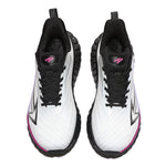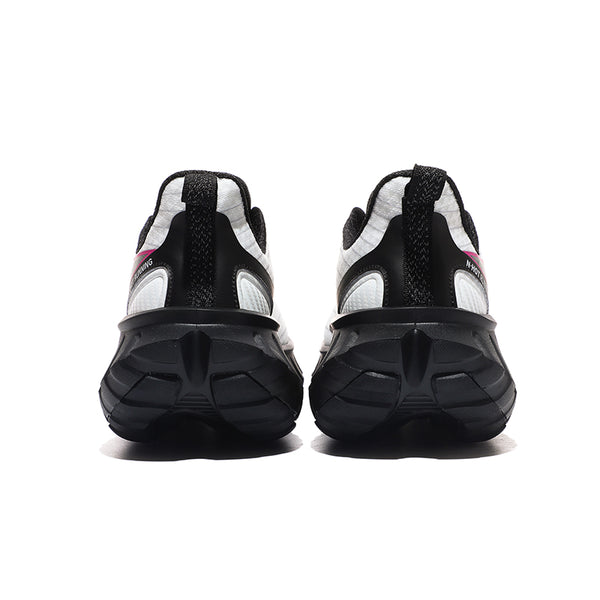 White/Black/Magenta– White upper with black details and magenta accents, paired with a striking black sculpted sole.